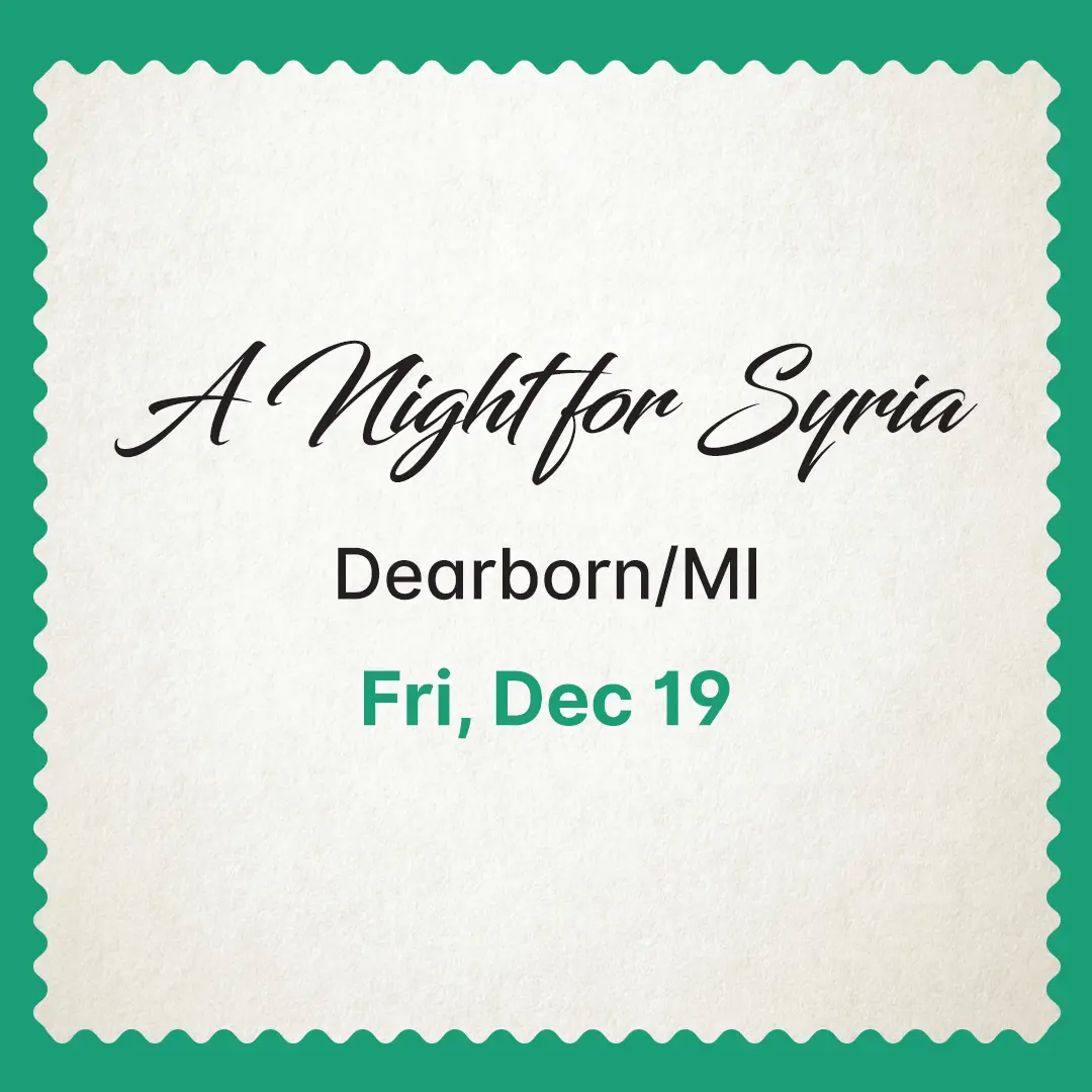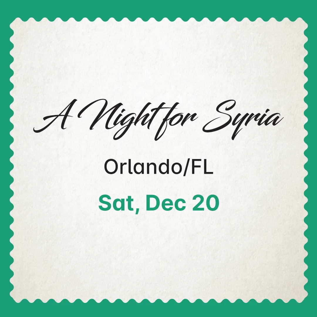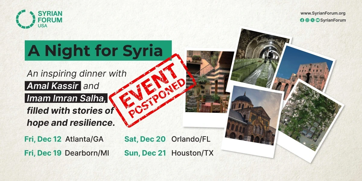 An Evening of Impact. A Celebration of Hope. Syrian Forum USA invites you to A Night for Syria — a powerful, inspirational event designed to connect hearts through poetry, music, and real stories of Syrian resilience. What to Expect: • Live poetry by Amal Kassir • Motivational speaker Imam Imran Salha • Traditional music and Syrian ambiance • A meaningful way to stand with Syrians still enduring the crisis Every detail of this evening honors the strength and spirit of Syrians from those rebuilding their lives inside Syria to those carrying their culture in the diaspora. Dinner will be served. Seats are limited. Save the dates.