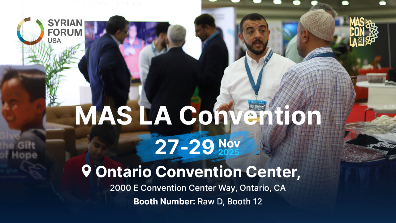 Join Syrian Forum USA from November 27–29, 2025, at the Ontario Convention Center in California (Row D, Booth 12), and learn how we are rebuilding lives and restoring hope for Syrian families.