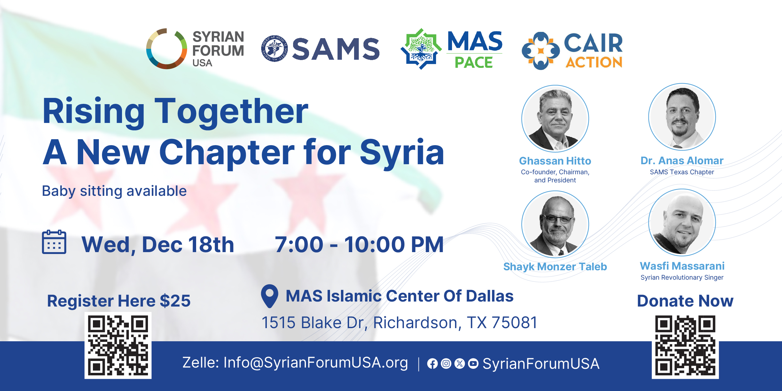 Syrian Forum USA, SAMS, MAS Pace, and CAIR Texas invite you to the “Rising Together: A New Chapter for Syria” Fundraising Dinner on December 18th, 7 p.m. – 10 p.m.