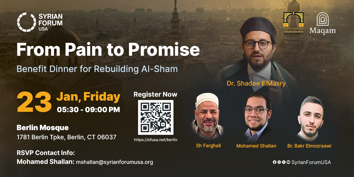 This special program will feature distinguished voices including Dr. Shadee ElMasry, Br. Bakr Elmozraawi, Sh. Farghali and Mohamed Shallan, who together will explore Syria’s enduring significance and the choices that will shape its tomorrow.
