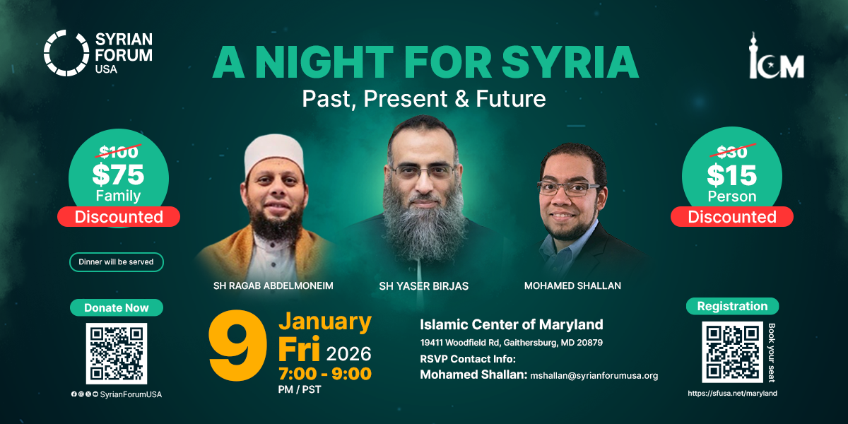 This special event will feature distinguished speakers — Sh Yaser Birjas, Sh Ragab Abdelmoneim, and Mohamed Shallan — who will share heartfelt insights on Syria’s resilience, faith, and hope for a brighter tomorrow.